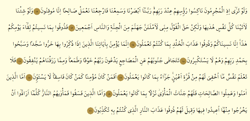 - Bir görsen o zaman suçluları; Rablerinin huzurunda başlarını eğmişler: “Ey Rabbimiz, gördük ve dinledik. şimdi bizi geri çevir de, iyi bir amel işleyelim; çünkü biz kesin inanç sahibi olduk.” derlerken.