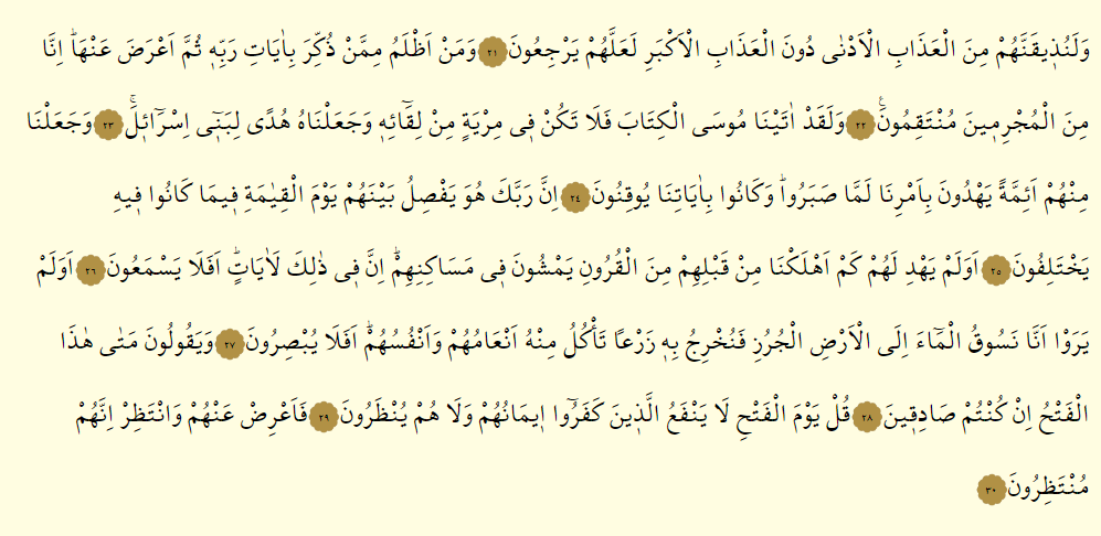 - Ve le nuzikannehum minel azabil edna dunel azabil ekberi leallehum yerciun.