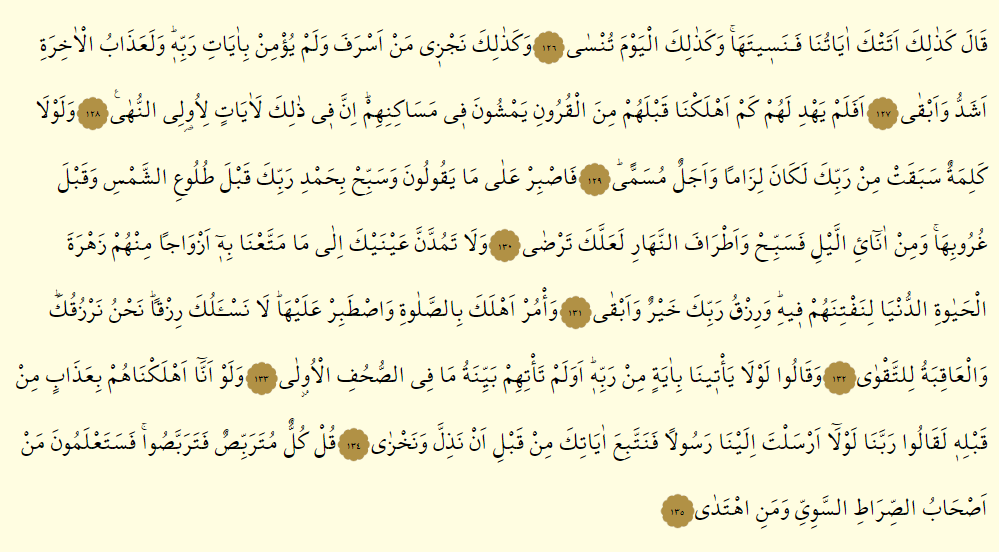 - Allah: “Öyle, sana ayetlerimiz geldi de sen onları unuttun. Bugün de böyle bırakılacaksın.” buyurur.