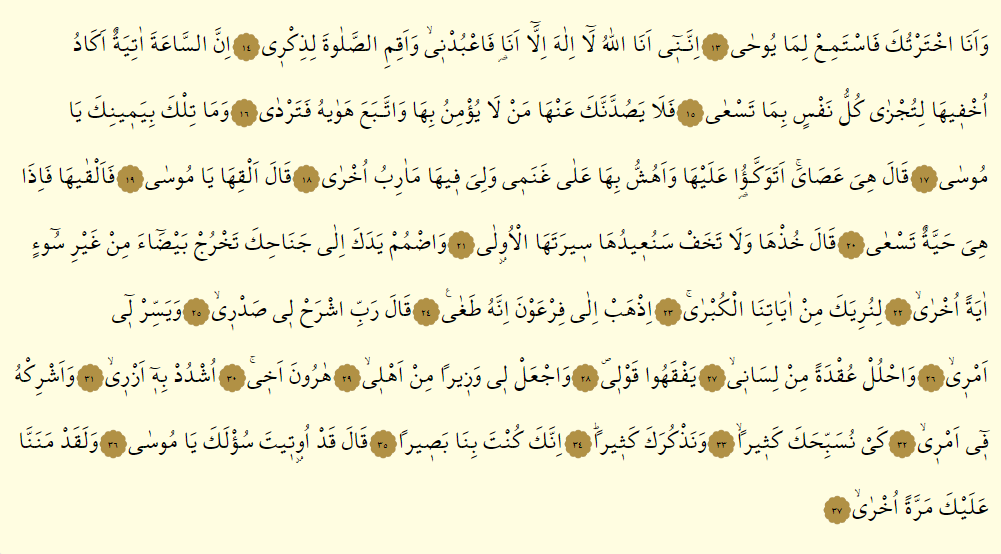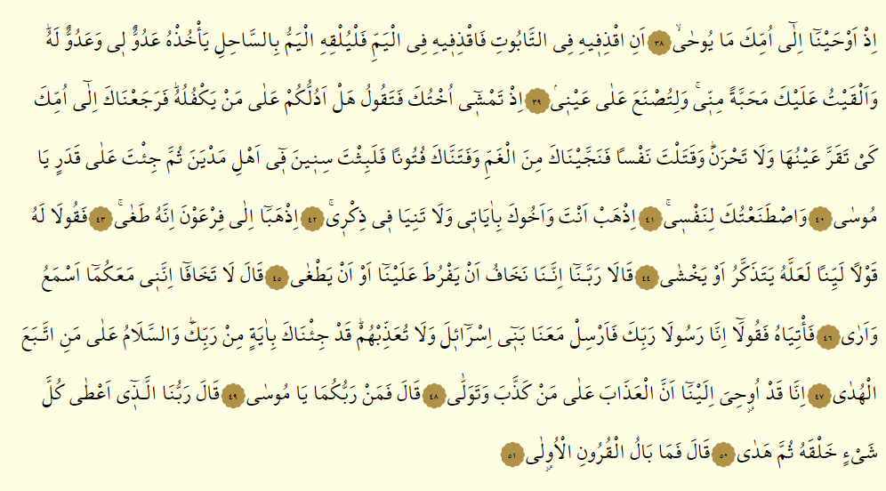 - İz temşi uhtuke fe tekulu hel edullukum ala men yekfuluh, fe reca’nake ila ummike key takarre aynuha ve la tahzen, ve katelte nefsen fe necceynake minel gammi ve fetennake futuna, fe lebiste sinine fi ehli medyene summe ci’te ala kaderin ya musa.
