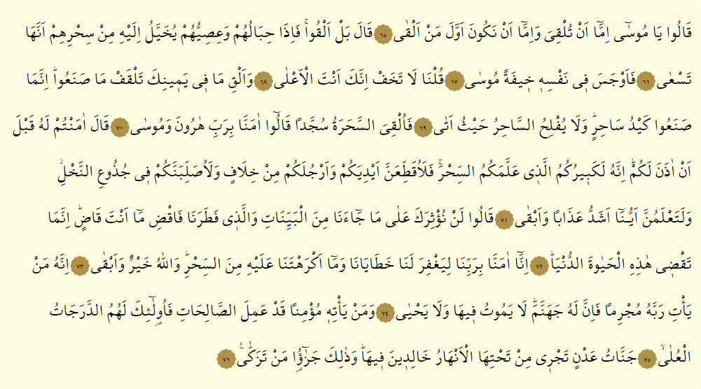 - Musa: “Haydi, siz atın!” dedi. Bir de baktı ki, onların ipleri ve sopaları, sihirleri sebebiyle, kendisine cidden koşuyorlarmış gibi görünüyor.