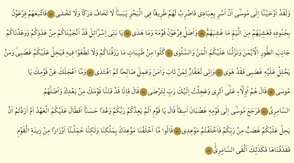 - Doğrusu Musa’ya şöyle vahyettik: “Kullarımla geceleyin yürü de onlara denizde kuru bir yol aç; yetişilmekten korkmaz ve endişe etmezsin.”
