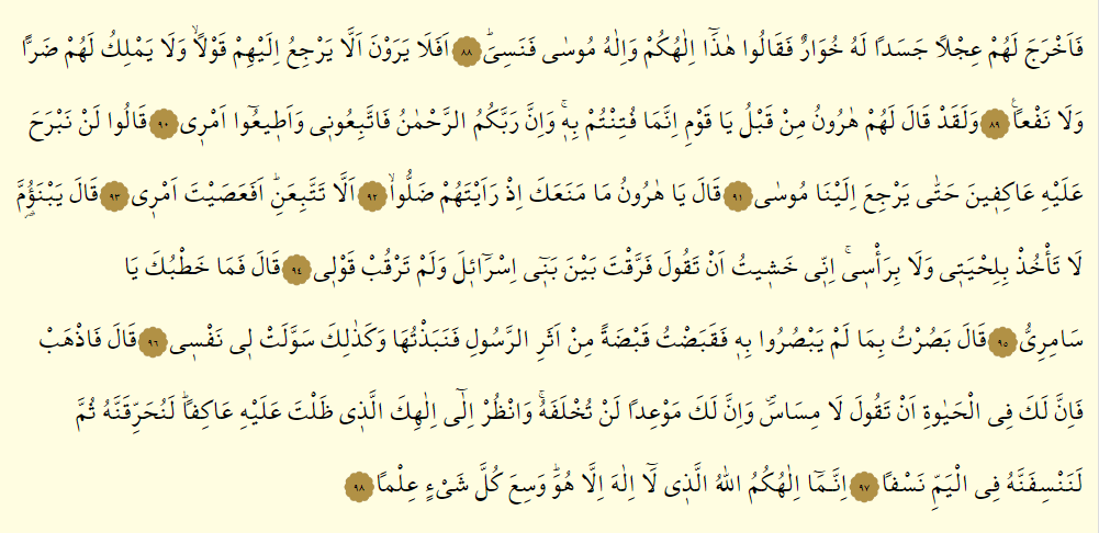 - Derken onlara, böğürmesi olan bir dana heykeli çıkardı. Bunun üzerine: “İşte bu, sizin ilahınız ve Musa’nın ilahıdır; fakat o, bunu unuttu.” dediler.