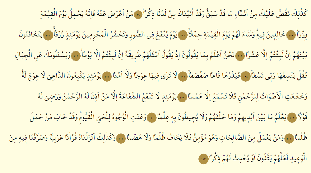 - O gün davetçiye hiçbir yana sapmadan uyacaklar. Öyle ki, Rahman’ın heybetinden sesler kısılmıştır; artık bir hışırtıdan başka birşey işitmezsin.