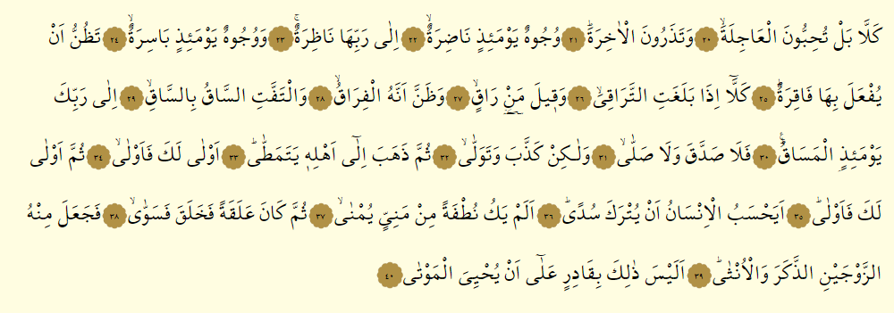 - Yemin ederim pişmanlık duyup dâimâ kendini kınayan nefse ki, siz mutlaka diriltilip hesâba çekileceksiniz!
