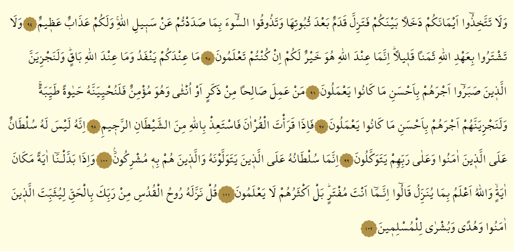- Ve la tettehızu eymanekum dehalen beynekum fe tezille kademun ba’de subutiha ve tezukus sue bima sadedtum an sebilillah, ve lekum azabun azim.