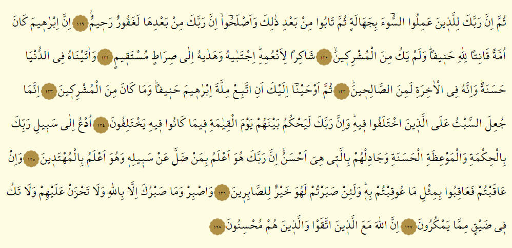 - Sonra muhakkak Rabbin, bir cehaletle kötülük işleyen sonra arkasından tevbe edip düzelen kimselerin lehinedir; şüphesiz ki, Rabbin, bunun arkasından elbette çok bağışlayandır, merhamet sahibidir.