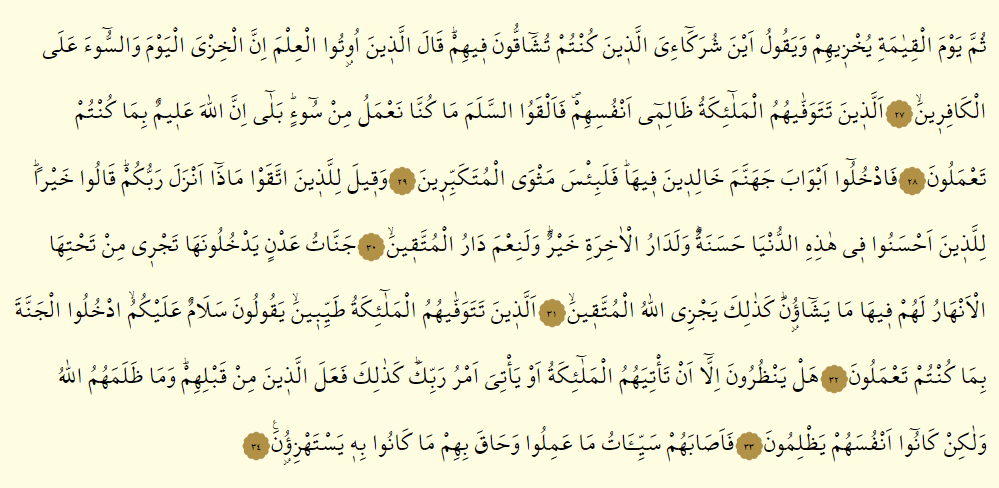 - Onlar ki, melekler, onların canlarını hoşça davranarak alırlar. “Selam size, girin cennete, çünkü çalışıyordunuz.” derler.