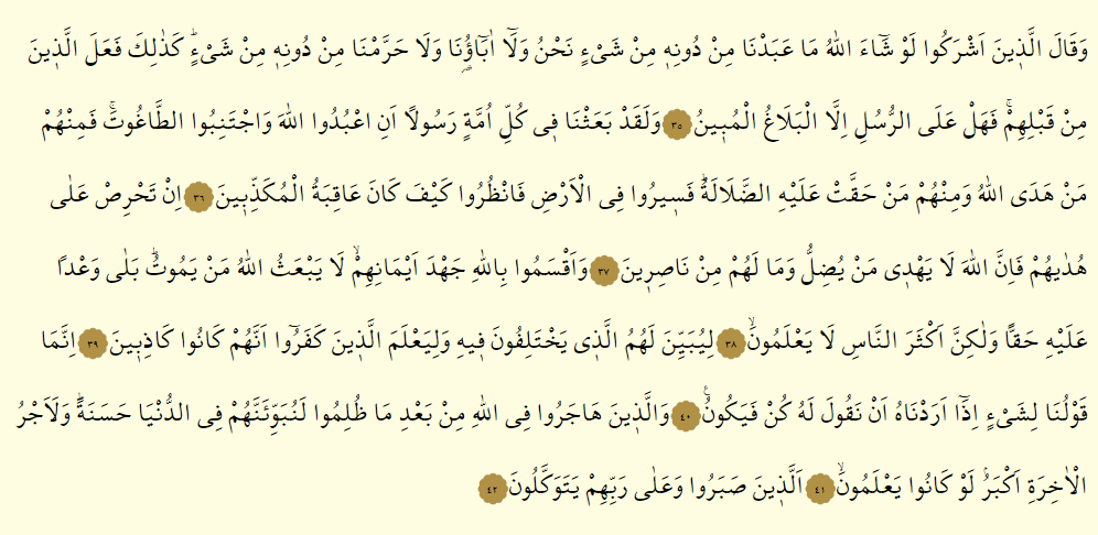 - Ve kalellezine eşreku lev şaallahu ma abedna min dunihi min şey’in nahnu ve la abauna ve la harremna min dunihi min şey’, kezalike fe alellezine min kablihim, fe hel aler rusuli illel belagul mubin.