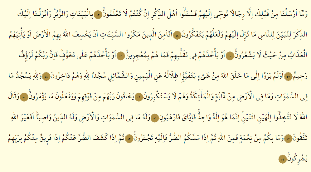 - Bil beyyinati vez zubur, ve enzelna ileykez zikre li tubeyyine lin nasi ma nuzzile ileyhim ve leallehum yetefekkerun.