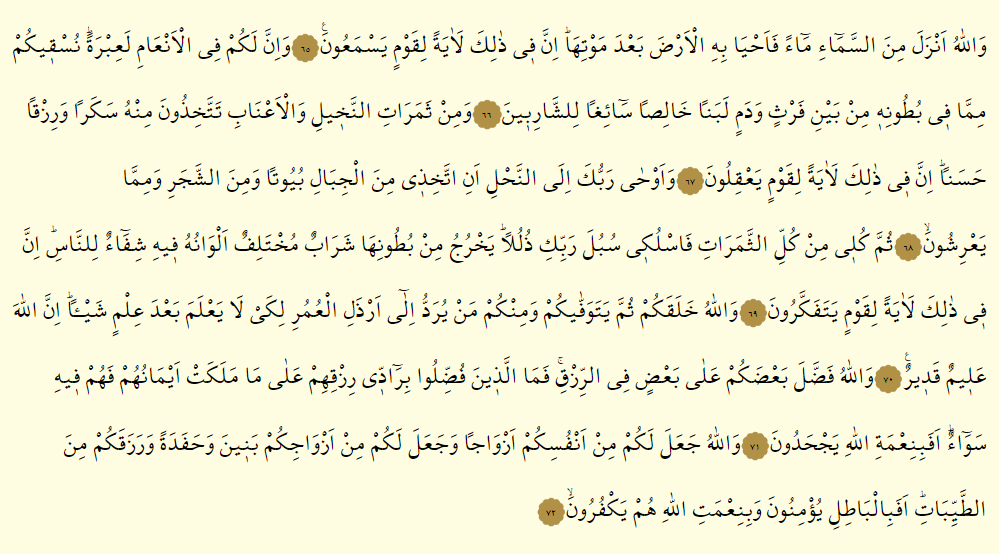 - Vallahu faddale ba’dakum ala ba’dın fir rızk, femellezine fuddılu bi raddi rızkıhim ala ma meleket eymanehum fe hum fihi seva’, e fe bi ni’metillahi yechadun.