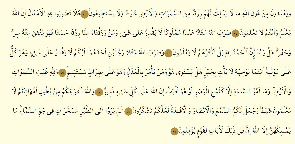 - Daraballahu meselen abden memluken la yakdiru ala şey’in ve men razaknahu minna rızkan hasenen fe huve yunfiku minhu sırren ve cehra, hel yestevun, elhamdulillah, bel ekseruhum la ya’lemun.