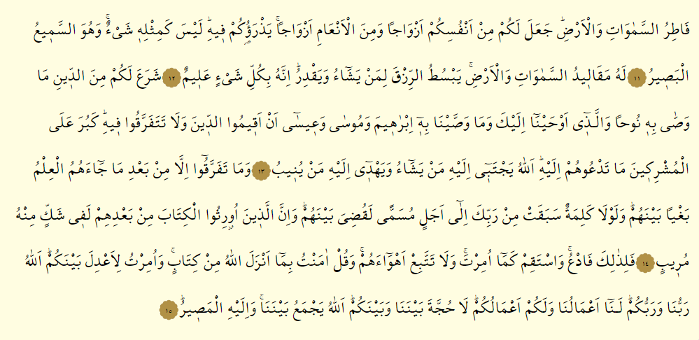 - Fe li zalike fed’u vestekım kema ümirt ve la tettebı’ ehvaehüm ve kul amentü bima enzelellahü min kitab ve ümirtü li a’dile beyneküm allahü rabbüna ve rabbüküm lena a’malüna ve leküm a’malüküm la huccete beynena ve beyneküm allahü yecmeu beynena ve ileyhil mesıyr