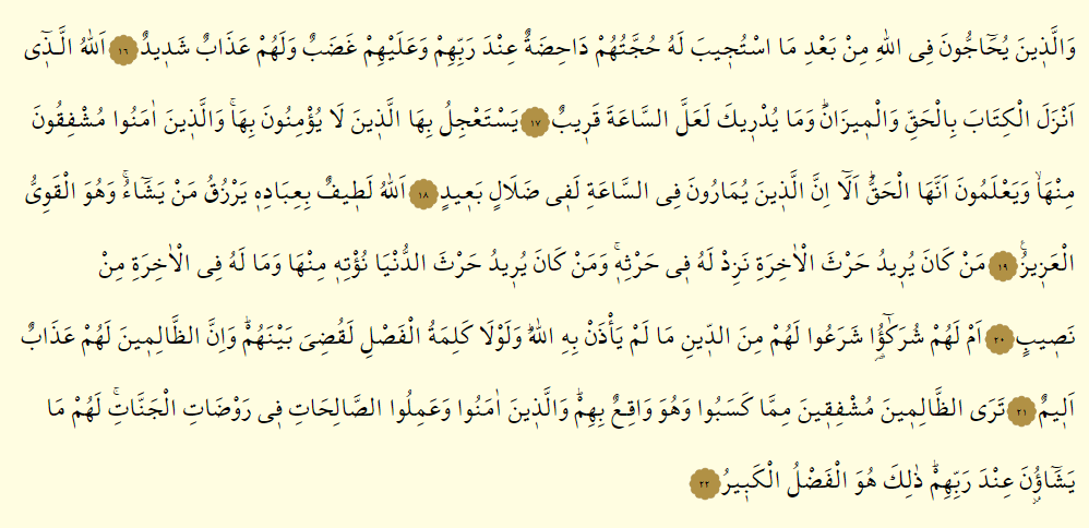 - İlâhî dâvet dürüst ve faziletli insanlar tarafından kabul görüp iman nûru kalplere yerleştikten sonra hâlâ Allah’ın dini hakkında tartışmaya kalkışanların itirazları ve sözde delilleri Rableri yanında geçersizdir. Onların üzerine bir gazap çökmüştür ve onlar için pek şiddetli bir azap vardır.