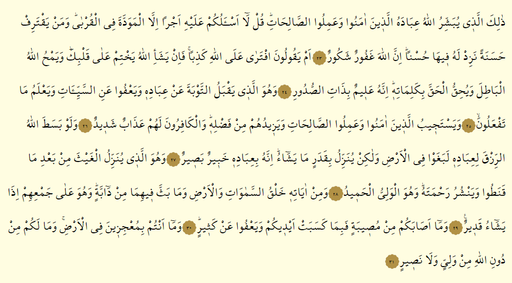 - İşte Allah, iman edip sâlih ameller işleyen kullarına bu başarı ve kazancı müjdelemektedir. Rasûlüm! De ki: “Tebliğime karşılık sizden hiçbir ücret istemiyorum. Sizden tek isteğim, akrabaya saygı ve sevgi gösterip insanlar arasındaki kardeşlik ve dostluk ilişkilerini gözetmenizdir.” Unutmayın ki, kim güzel bir iş yaparsa, onu daha güzel işler yapmaya yönlendirir, yaptığı güzelliklerin sevabını da fazlasıyla veririz. Muhakkak ki Allah, çok bağışlayandır, her güzel iş ve davranışın karşılığını bol bol verendir.