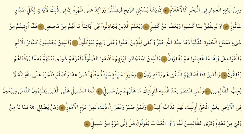 - Ve cezaü seyyietin seyyietüm mislüha fe men afa ve asleha fe ecruhu alellah innehu la yühıbbüz zalimın