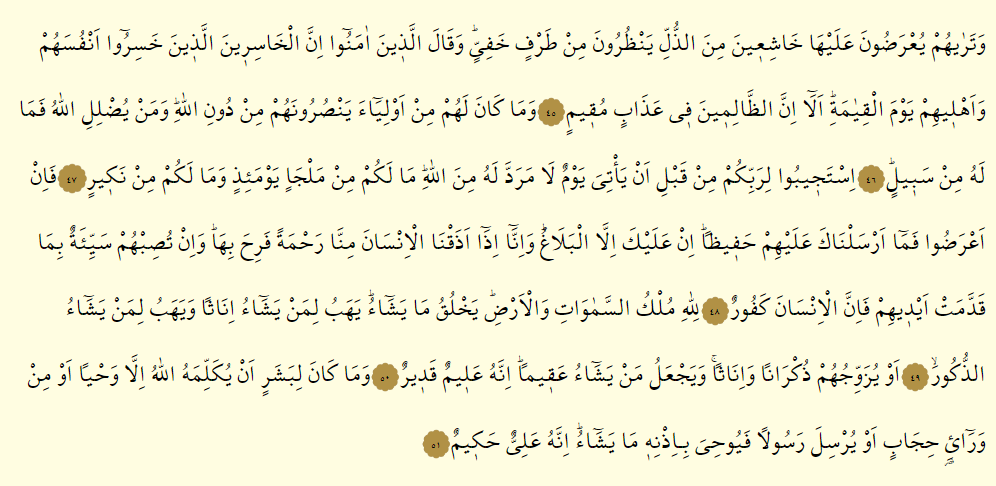 - Ve terahüm yu’radune aleyha haşiıyne minez zülli yenzurune min tarfin hafiyy ve kalellezıne amenu innel hasirınellezıne hasiru enfüsehüm ve ehlıhim yevmel kıyameh e la innez zalimıne fı azabim mükıym