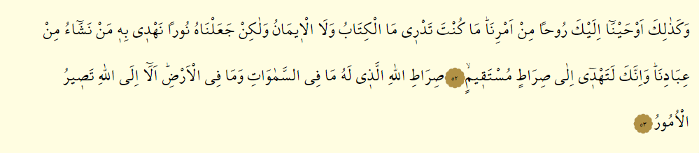- Ve kezalike evhayna ileyke ruham min emrina ma künte tedrı mel kitabü ve lel ımanü ve lakin cealnahü nuran nehdı bihı men neşaü min ıbadina ve inneke le tehdı ila sıratım müstekıym