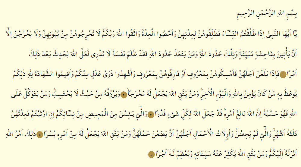 - Ya eyyuhennebiyyu iza tallaktumunnisae fetallikuhunne li’ıddetihinne ve ahsıl’ıddete vettekullahe rabbekum la tuhricuhunne min buyutihinne ve la yahrucne illa en ye’tiyne bifahışetin mubeyyinetin ve tilke hududullahi ve men yete’adde hududallahi fekad zaleme nefsehu la tedriy le’allellahe yuhdisu ba’de zalike emren.