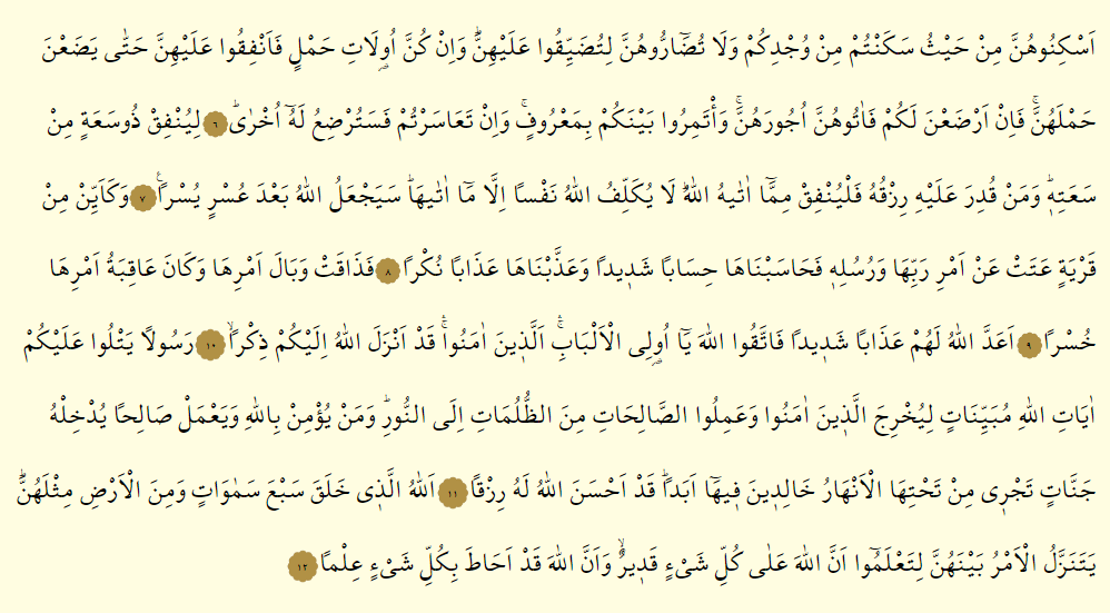- Eskinuhunne min haysu sekentum min vucdikum ve la tudarruhunne litudayyiku ‘aleyhinne ve in kunne ulati hamlin feenfiku ‘aleyhinne hatta yeda’ne hamlehunne fein erda’ne lekum featuhunne ucurehunne ve’temiru beynekum bima’rufin ve in te’asertum feseturdı’u lehu uhra.