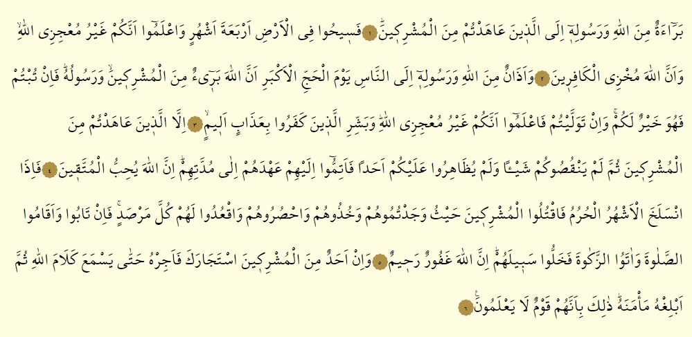 - Ve ezanun minallahi ve resulihi ilen nasi yevmel haccıl ekberi ennallahe beriun minel muşrikine ve resuluh , fe in tubtum fe huve hayrun lekum, ve in tevelleytum fa’lemu ennekum gayru mu’cizillah , ve beşşirillezine keferu bi azabin elim.