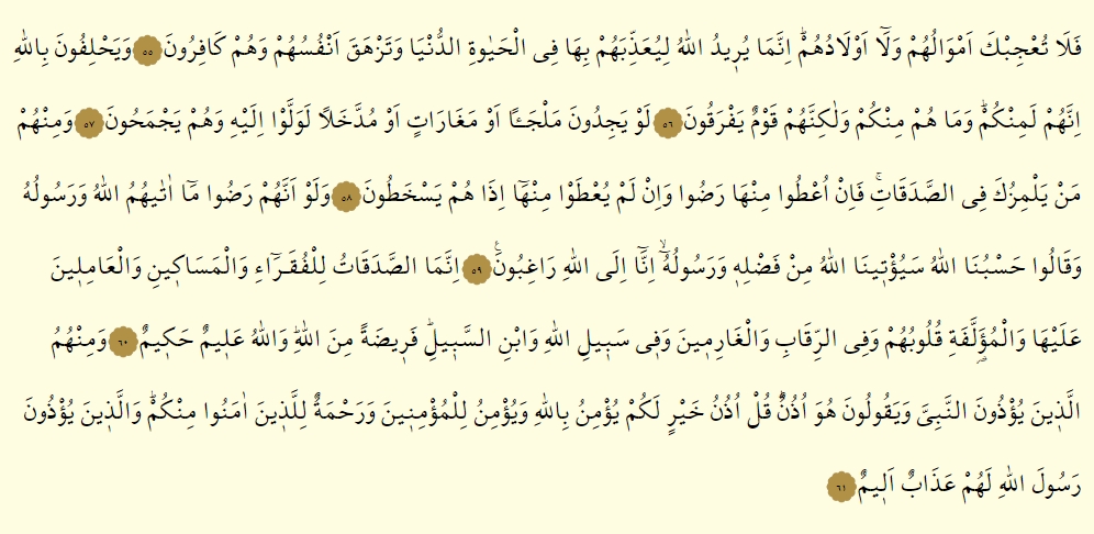 - Ve La tu’cibke emvaluhum ve evladuhum, innema yuridullahu en yuazzibehum biha fid dunya ve tezheka enfusuhum ve hum kafirun.