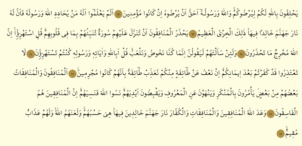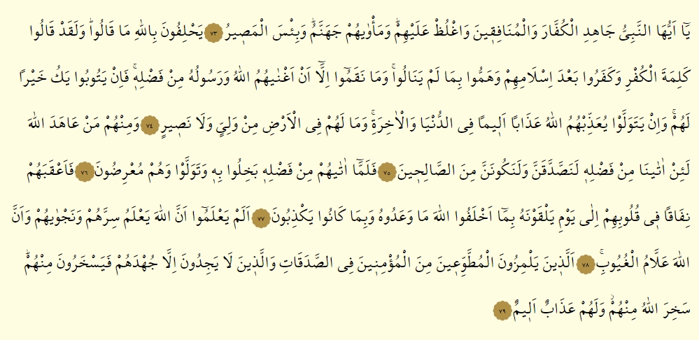 - Yahlifune billahi ma kalu, ve lekad kalu kelimetel kufri ve keferu ba’de islamihim ve hemmu bi ma lem yenalu, ve ma nekamu illa en egnahumullahu ve resuluhu min fadlih, fe in yetubu yeku hayren lehum, ve in yetevellev yuazzibhumullahu azaben elimen fid dunya vel ahıreh, ve ma lehum fil ardı min veliyyin ve la nasir.