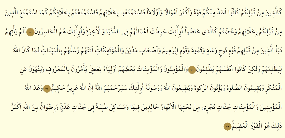 - Kellezine min kablikum kanu eşedde minkum kuvveten ve eksere emvalen ve evlada, festemteu bi halakihim, festemta’tum bi halakikum kemastemteallezine min kablikum bi halakihim ve hudtum kellezi hadu, ulaike habitat a’maluhum fid dunya vel ahıreh, ve ulaike humul hasirun .