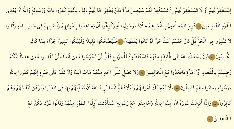 - İstagfir lehum ev la testagfir lehum, in testagfir lehum seb’ine merreten fe len yagfirallahu lehum, zalike bi ennehum keferu billahi ve resulih, vallahu la yehdil kavmel fasikin.