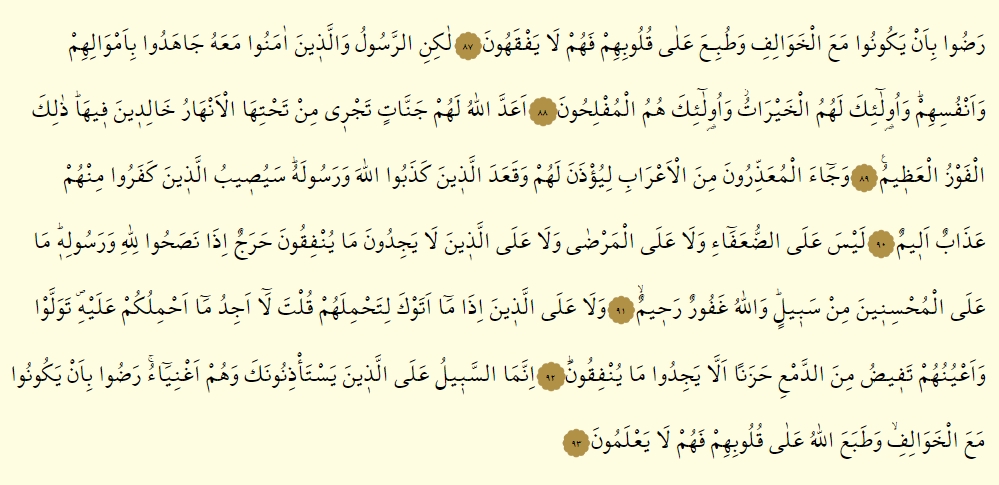 - İnnemes sebilu alellezine yeste’zinuneke ve hum agniya’, radu bi en yekunu meal havalifi ve tabeallahu ala kulubihim fe hum la ya’lemun.