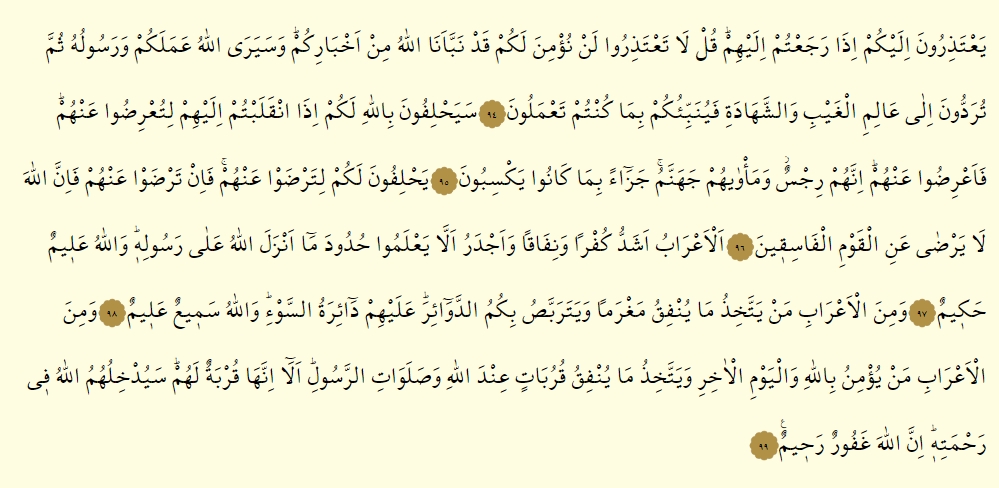 - Yanlarına döndüğünüzde size özür beyan edecekler. De ki: “Özür beyan etmeyin, asla size inanmayacağız! Doğrusu Allah bize durumunuzdan birçok haberler verdi; bundan böyle de Allah ve Resulü yaptıklarınızı görecektir; sonra hepiniz gizliyi aşikarı bilen Allah’ın huzuruna götürüleceksiniz. O vakit O, size neler yaptığınızı haber verecektir.