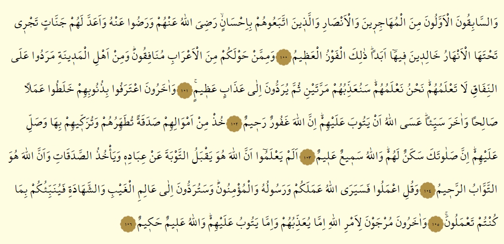 - Muhacirlerle Ensardan Sabikun-i evvelin =İslam’da ilk grubu oluşturanlar ve iyi amellerle onların ardınca gidenler, işte Allah onlardan razı oldu, onlar da Allah’tan razı oldular ve onlara altlarından ırmaklar akan cennetler hazırladı ki, içlerinde ebedi kalacaklar. İşte büyük kurtuluş budur.