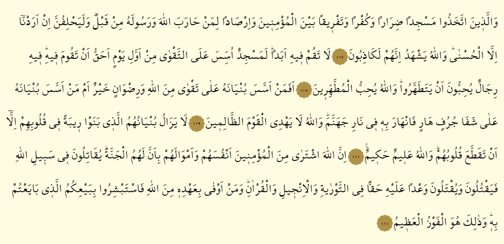 - Bir de inadına zarar vermek, kafirlik etmek, mü’minlerin arasına tefrika sokmak ve daha önce Allah ve peygamberine karşı savaş açan bir herife pusu, gözcülük yapıvermek için tuttular bir mescit yaptılar. Bununla beraber, “İyi niyetten başka bir maksadımız yoktur!” diye yemin edecekler. Fakat bunların kesinlikle yalancı olduklarına Allah şahittir.