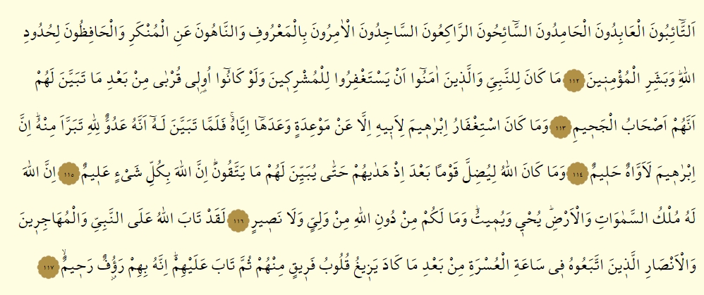 - O tevbe edenler, o ibadet edenler, o hamdedenler, o oruç tutanlar, o rukua varanlar, o secdeye kapananlar, o iyiliği emredip kötülükten alıkoyanlar ve Allah’ın koyduğu sınırı koruyanlar… Müjdele o mü’minleri!
