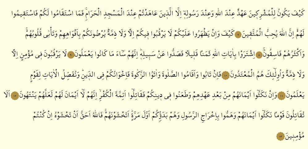 - Keyfe yekunu lil muşrikine ahdun ındallahi ve ınde resulihi illellezine ahedtum ındel mescidil haram, fe mestekamu lekum festekimu lehum, innallahe yuhıbbul muttekin.