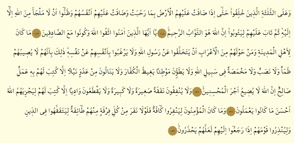 - Geri bırakılmış o üç kişiye de…; nihayet o derece bunalmışlardı ki, yeryüzü bütün genişliğiyle başlarına dar geldi, vicdanları da kendilerini sıktı ve Allah’tan yine Allah’a sığınmaktan başka çare olmadığını anladılar. Evet tam o zaman tevbelerinin kabulü ile tekrar iltifat buyurdu ki, o tevbekarlar arasına girsinler. Şüphesiz ki Allah, ancak O, tevbeleri çokça kabul eder, çok merhamet eder.