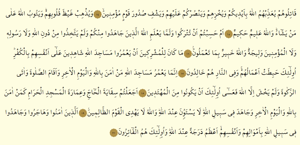 - Katiluhum yuazzibhumullahu bi eydikum ve yuhzihim ve yansurkum aleyhim ve yeşfi sudure kavmin mu’minin.