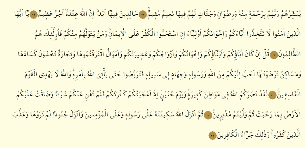 - Kul in kane abaukum ve ebnaukum ve ıhvanukum ve ezvacukum ve aşiretukum ve emvalunıktereftumuha ve ticaretun tahşevne kesadeha ve mesakinu terdavneha ehabbe ileykum minallahi ve resulihi ve cihadin fi sebilihi fe terabbesu hatta ye’ tiyallahu bi emrih, vallahu la yehdil kavmel fasikin.