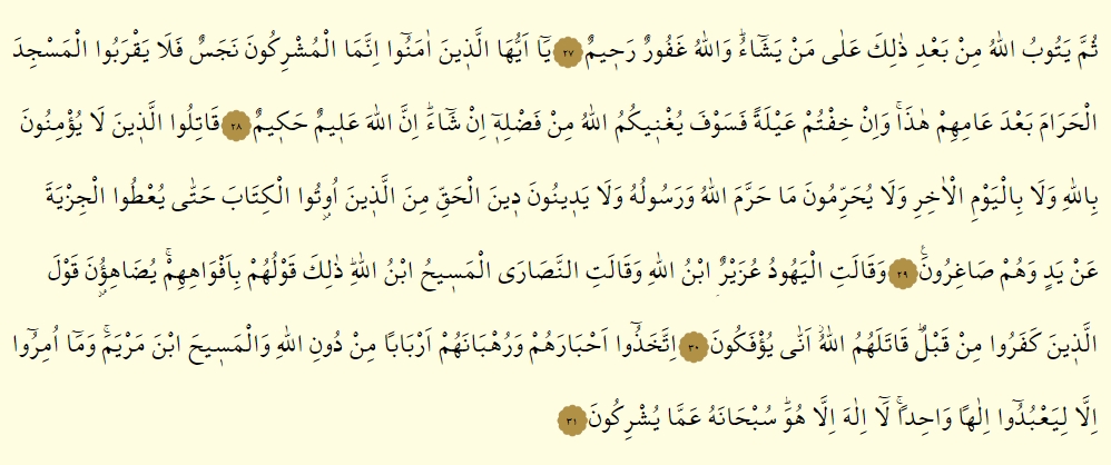 - Katilullezine la yu’minune billahi ve la bil yevmil ahıri ve la yuharrimune ma harremallahu ve resuluhu ve la yedinune dinel hakkı minellezine utul kitabe hatta yu’tul cizyete an yedin ve hum sagirun.