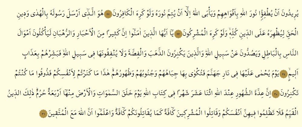 - İnne iddeteş şuhuri indallahisna aşere şehren fi kitabillahi yevme halakas semavati vel arda minha erbeatun huruma zaliked dinul kayyimu fe la tazlimu fihinne enfusekum ve katilul muşrikine kaffeten kema yukatilunekum kaffeh, va’lemu ennallahe meal muttekin.