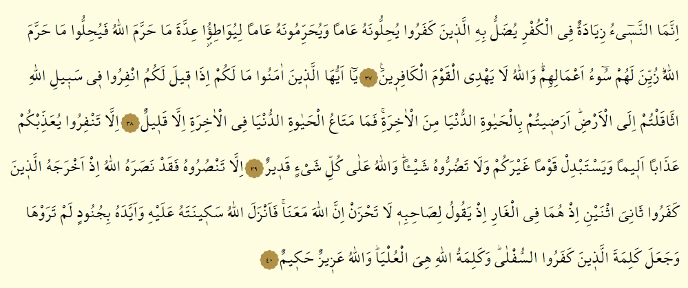 - İnnemen nesiu ziyadetun fil kufri yudallu bihillezine keferu yuhillunehu amen ve yuharrimunehu amen li yuvatiu iddete ma harremallahu fe yuhillu ma harremallah, zuyyine lehum suu a’malihim, vallahu la yehdil kavmel kafirin.