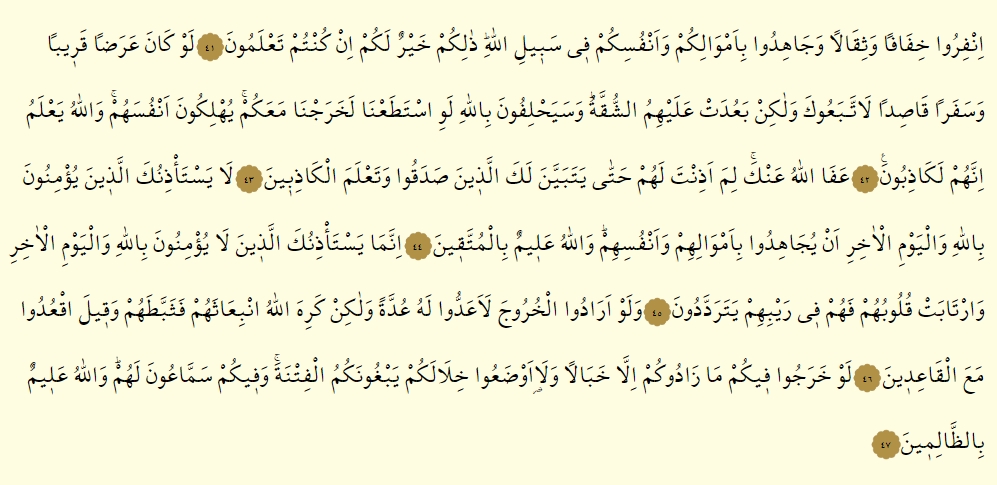 - Gerek hafif, gerekse ağırlıklı, hepiniz istisnasız savaşa çıkın, mallarınızla canlarınızla Allah yolunda cihad ediniz! Eğer bilir takımındansanız, bu sizin için hayırdır.
