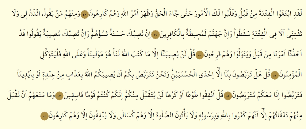 - Ve ma meneahum en tukbele minhum nefekatuhum illa ennehum keferu billahi ve bi resulihi ve la ye’tunes salate illa ve humkusala ve la yunfikune illa ve hum karihun.